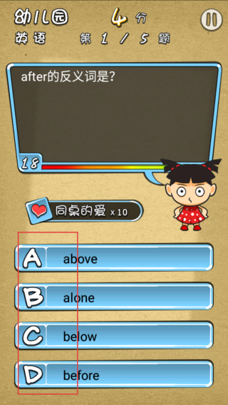 4、回答英语题,根据题目选择正确选项,完成题目推进游戏。