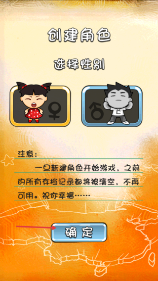 2、选择角色性别后点击【确定】,注意存档提示,进入游戏主进程。