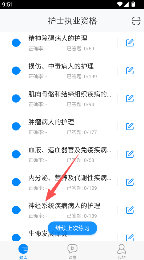 2、进入题库,选择备考模块(如神经系统疾病病人的护理)。