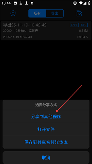 4、在分享方式中选择【分享到其他程序】,完成音频分享操作。