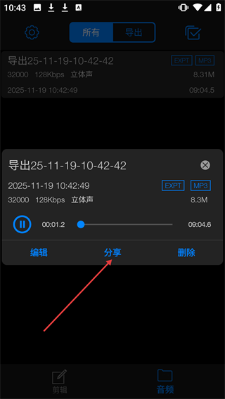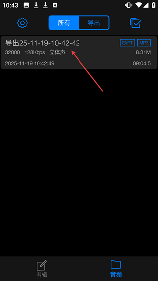 2、在音频管理界面找到目标音频文件“导出25-11-19-10-42-42”。