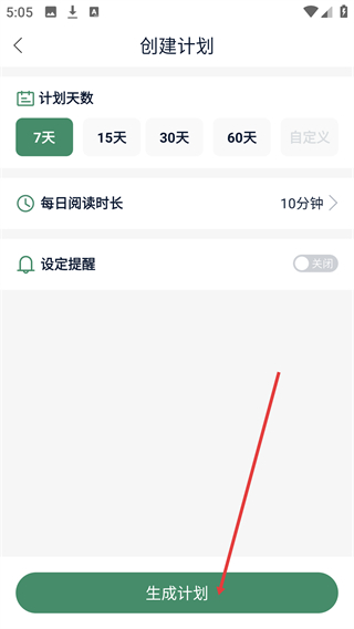 4、在【创建计划】页面,可选择【7天】-【30天】等计划天数,设置【每日阅读时长】后点【生成计划】完成创建。