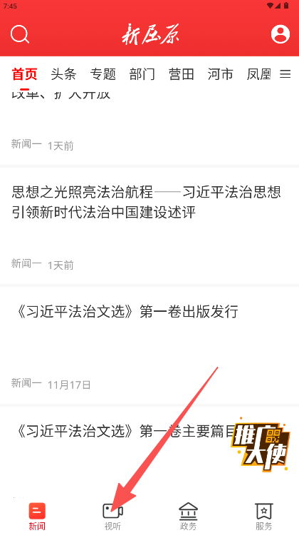 1、在首页底部导航栏点击“视听”图标进入视听内容页面。