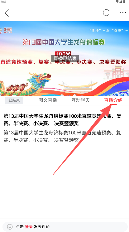 3、进入直播介绍详情页可观看回放、查看图文直播或参与互动聊天。