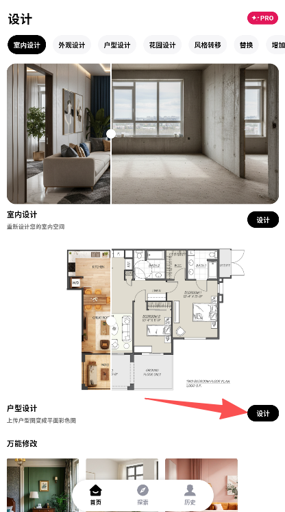 《AI装修伴侣》是一款运用智能技术辅助装修设计的软件。核心特色是提供多种设计模式,包括室内设计、外观设计、花园设计及风格转移,支持对现有空间进行重新设计或局部修改。软件亮点在于操作直观高效,上传户型图即可转换为清晰的平面彩色图。功能模块划分明确,通过底部导航轻松切换首页、探索与历史记录,为装修设计提供便捷、可视化的创意支持。