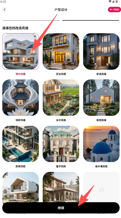 3、点击目标风格选定风格后点击底部“继续”设计成品图。