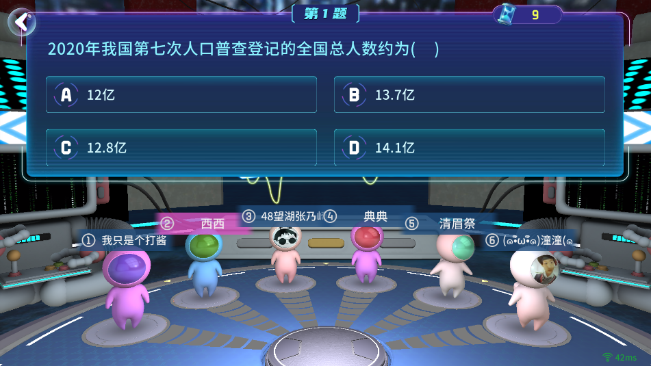 3、答题模式,以6人为一组,由系统出5道题目,全部回答完毕则会公布,每个人的排名顺序。