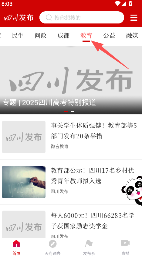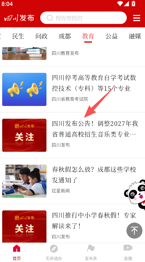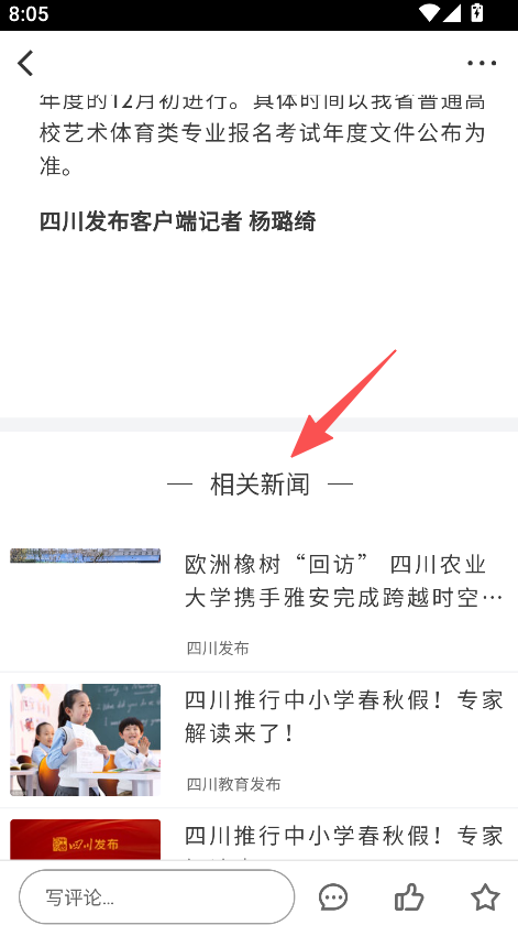 2、选择新闻(如四川发布公告调整招生),进入新闻详情页。