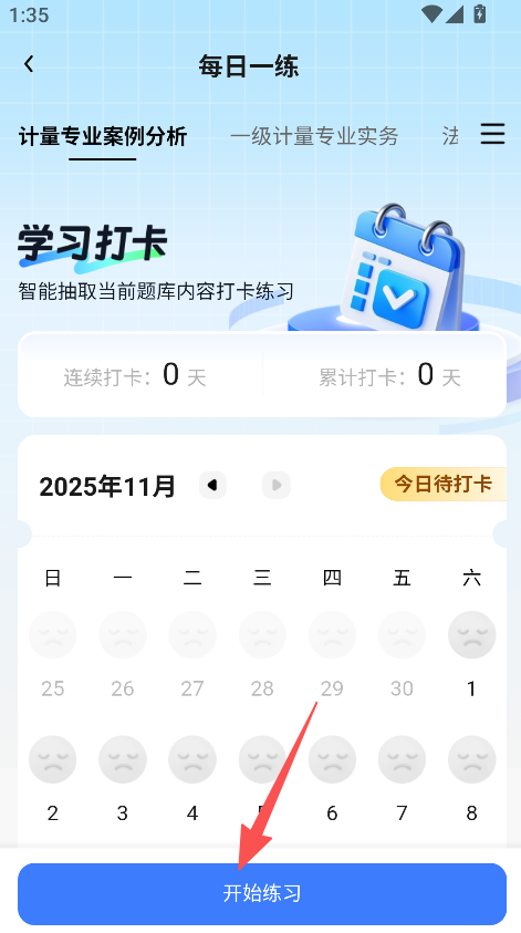 2、进入每日一练,点击开始练习,进行日常刷题打卡。