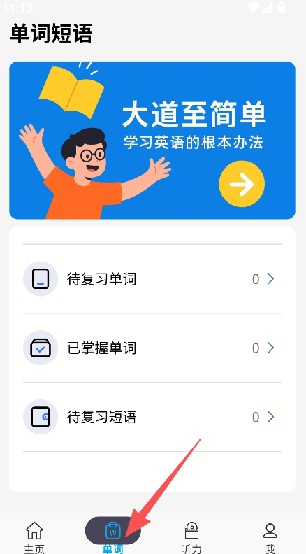 1、进入单词板块,查看待复习单词、已掌握单词,管理英语词汇学习。