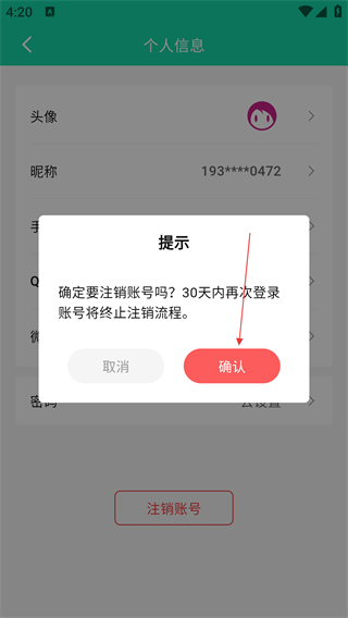 4、在提示弹窗中,确认注销说明后点击【确认】,启动账号注销流程。