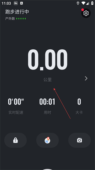 4、进入跑步进行中页面,可查看实时公里数、用时等数据,记录跑步过程中的运动信息。