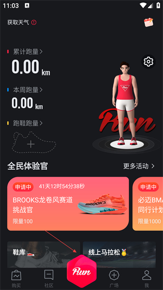 2、在主界面,点击底部中间的【Run】按钮,进入跑步模式的选择与地图界面。