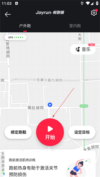 3、在跑步界面确认模式(如户外跑)后,点击中间【开始】按钮,启动跑步记录。