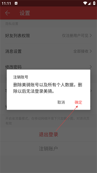 4、阅读弹窗中的注销说明(删除账号及个人数据、无法再登录)后,点击【确定】完成账号注销。