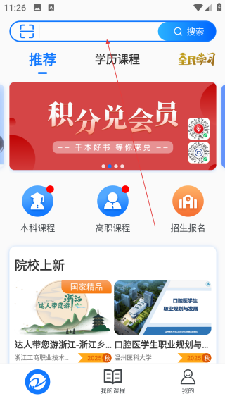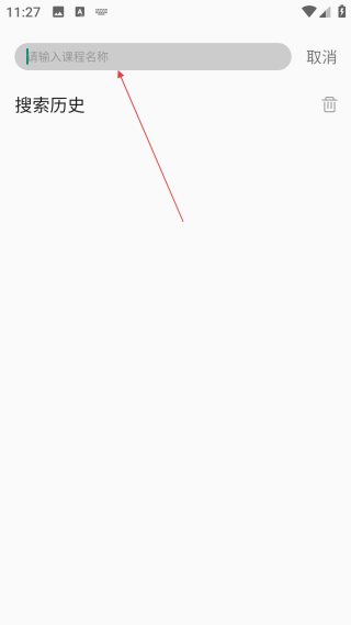 1、在首页,点击【顶部搜索框】,进入课程名称的输入搜索界面。