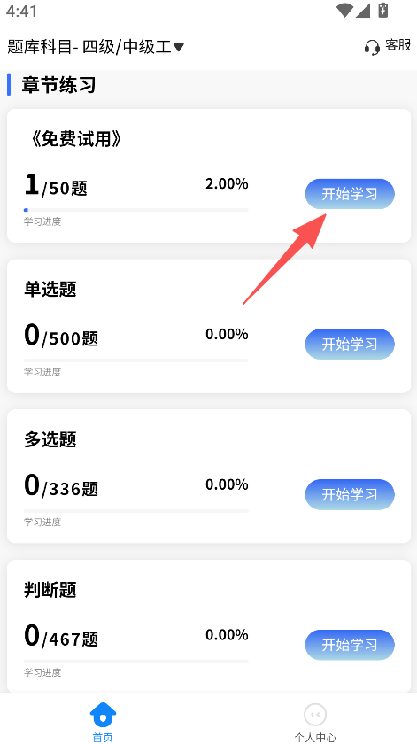 1、选择章节练习(如免费试用),点击开始学习,进入答题环节。