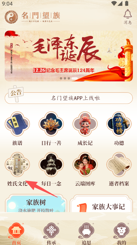 2、以文化传承为导向,提供姓氏起源、族谱管理、功德记录,助力用户探索家族历史、传承文化,满足家族文化需求。