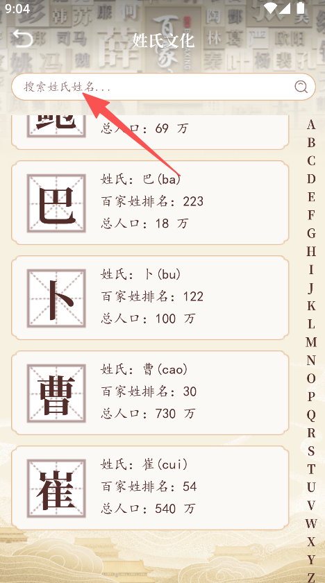 1、具备姓氏查询功能,支持姓氏搜索,快速了解姓氏排名、人口及文化详情。
