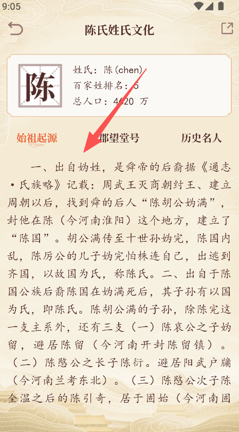 2、查看姓氏文化详情,了解始祖起源、郡望堂号等内容。