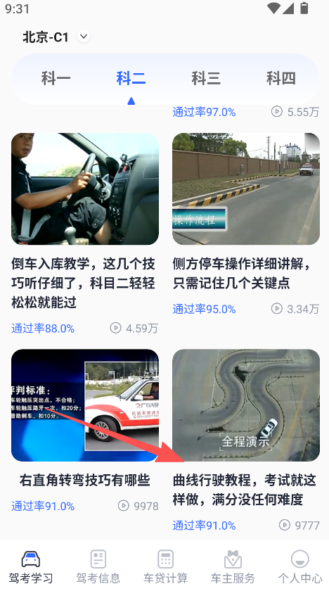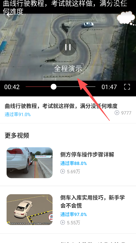 2、点击考点视频(如曲线行驶教程),进入视频播放页。