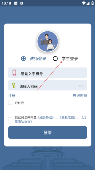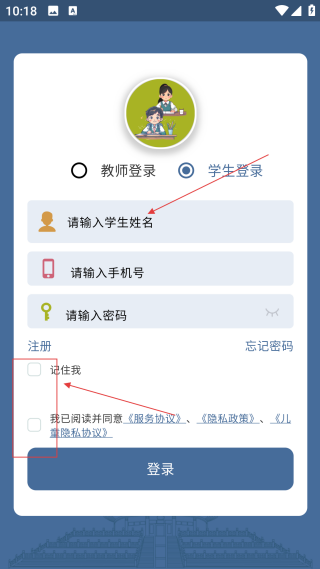2、在学生登录页【填写姓名】,勾选【协议与记住我】选项。
