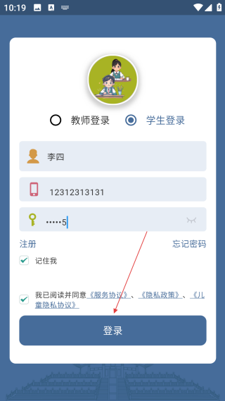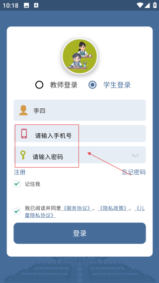 3、依次填写【手机号与密码】,准备完成学生账号的登录操作。