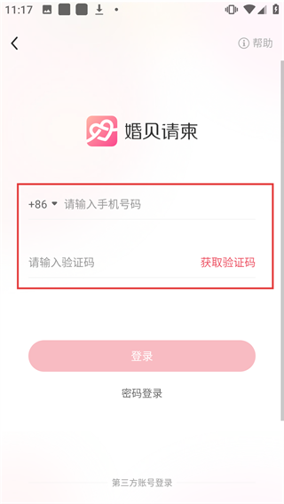 4、在婚贝请柬登录页面输入手机号码,获取并输入验证码后登录,即可继续制作婚礼邀请。