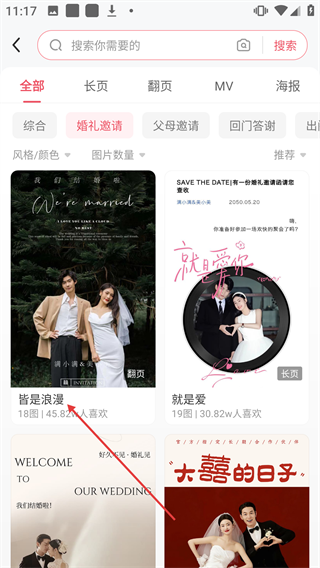 2、在婚礼邀请模板列表中点击【皆是浪漫】模板,进入模板预览页面。