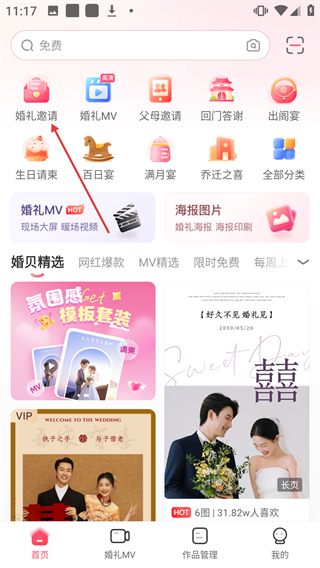 1、在婚贝请柬首页点击【婚礼邀请】,进入婚礼邀请模板选择页面。