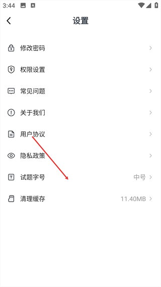 3、在【设置】页面,找到【试题字号】选项并点击。