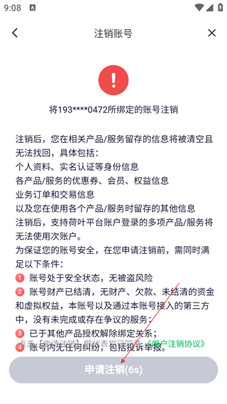4、阅读注销须知并确认满足条件后,点击【申请注销】,完成账号注销操作。