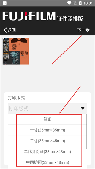 3、进入证件照排版页面,打开【打印版式】选项列表,选定对应规格后,点击【下一步】。