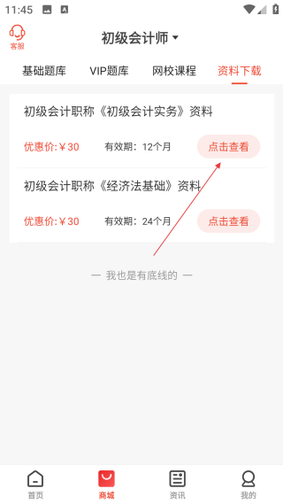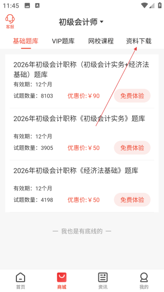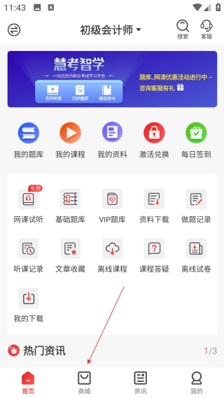 1、在初级会计师,首页点击底部【商城】,进入课程与资料的选购页面。