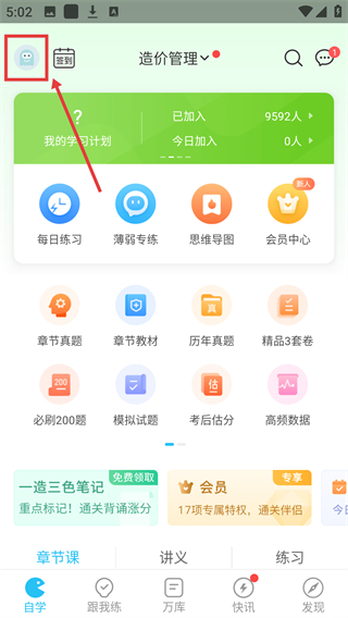 1、在【自学】页面,点击左上角的头像按钮,可进入对应页面。