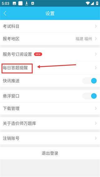 3、进入【设置】页面后,找到并点击【每日答题提醒】选项。
