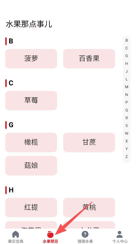1、分类体系清晰,水果禁忌按字母(B、C、G等)分类,涵盖菠萝、草莓、柠檬等多种日常水果,用户可快速定位目标水果的禁忌信息。