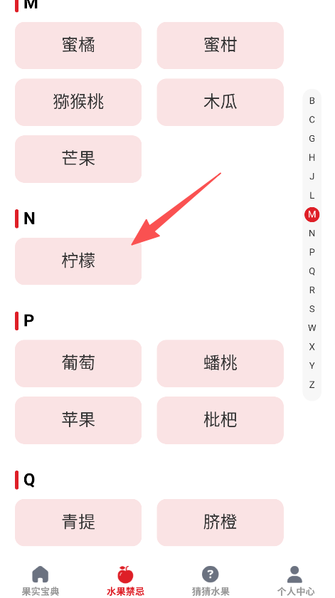 1、禁忌查询功能,按字母分类展示多种水果,点击水果(如柠檬)可查看详细禁忌说明,助力用户掌握科学食用禁忌。