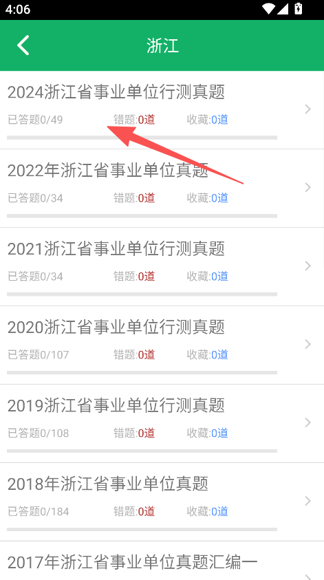 2、选择真题年份(如2024浙江省事业单位行测真题),开始做题。