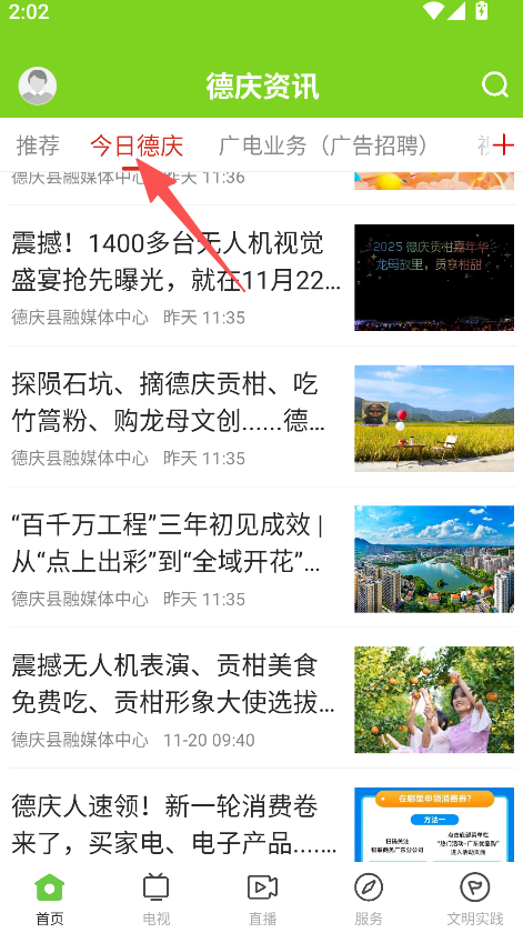 1、打开软件,点击今日德庆,浏览无人机表演、贡柑采摘等本地资讯。