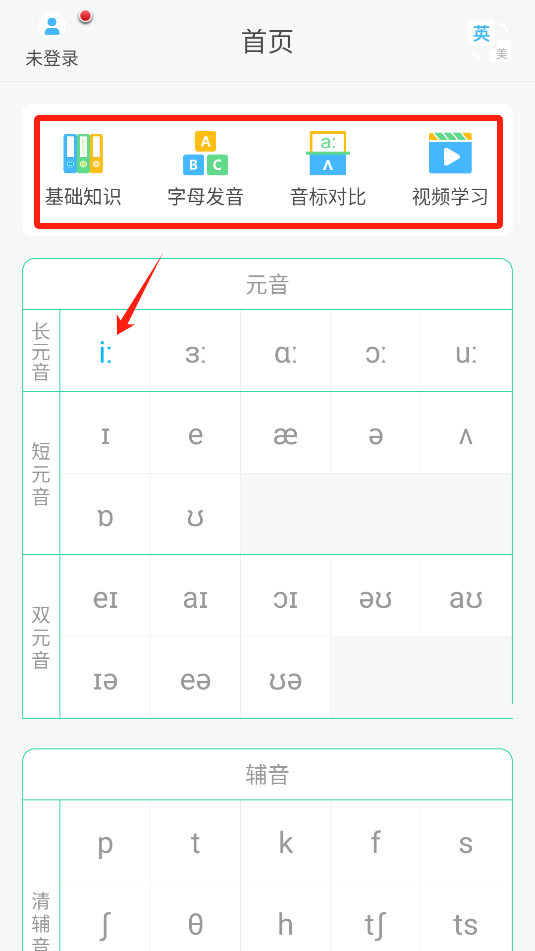 1、在主界面中,分为四部分学习板块,基础知识中,先学习音标的发音。