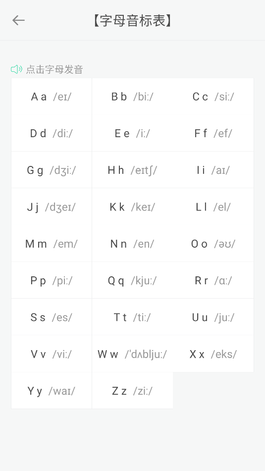 3、字母发音,可点击每一个英文字母,对照的音标和朗读。