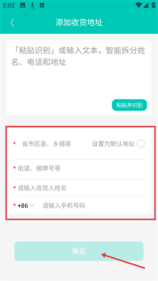 4、进入【添加收货地址】页面,填写【省市区县、乡镇等】等必填信息,可使用【粘贴并识别】功能,填完点击【确定】完成添加。