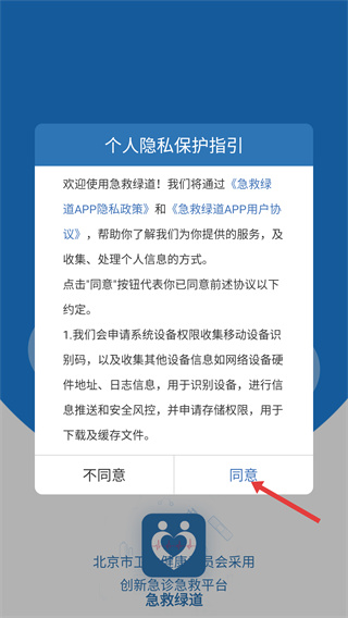 1、在【急救绿道】个人隐私保护指引页面点击【同意】,确认接受隐私政策和用户协议,进入登录流程。