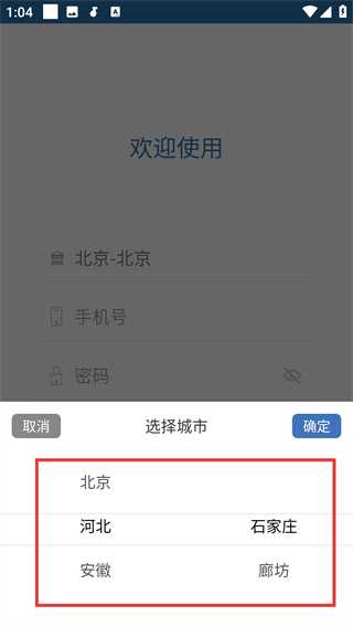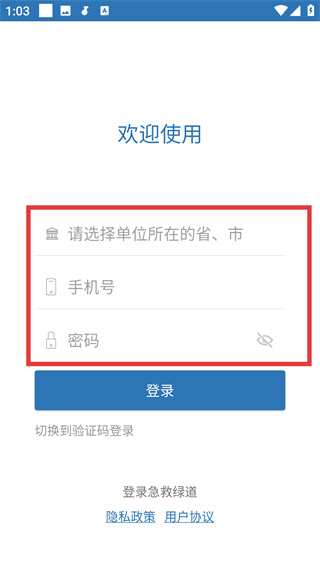 2、在登录页面依次选择单位所在省市、输入手机号、设置密码,完成登录信息填写。