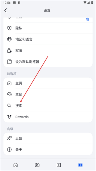 3、在设置界面首选项分类下,找到搜索选项并点击进入对应页面。