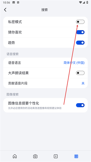 4、在搜索页面找到私密模式选项,点击对应开关即可开启该功能。