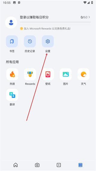 1、打开微软必应首页,点击底部导航栏功能图标进入应用的功能页面。