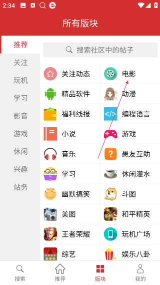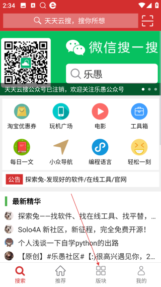 1、在搜索页,点击底部【版块】,进入所有版块的分类页面。