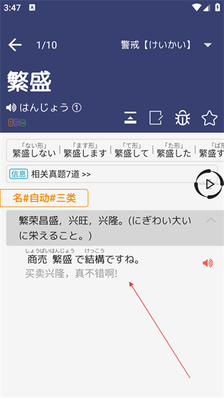 4、在单词详情页,可查看单词的变形形式、例句,点击音频按钮可收听发音。